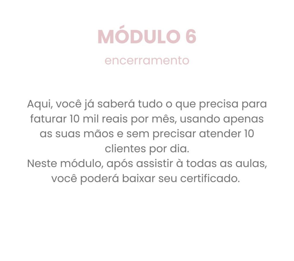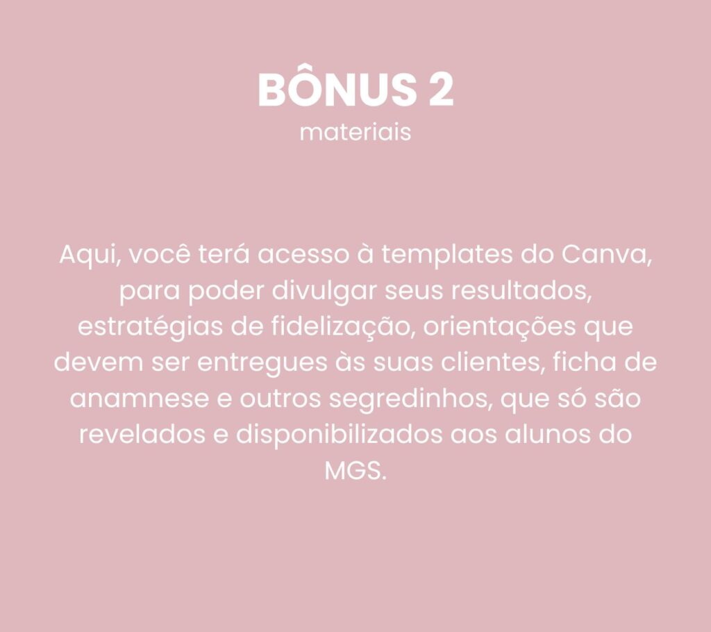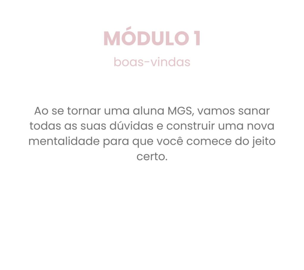 Você terá acesso à área exclusiva para membros, com aulas gravadas, apostilas, templates e orientações para os seus clientes. Você também poderá participar de 2 encontros ao vivo, que também são restritos aos alunos do MGS. Além disso, todas as suas dúvidas serão respondidas em até 48 horas. Após concluir o curso, você poderá baixar seu certificado.